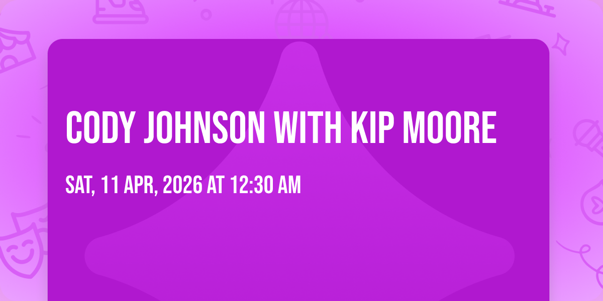 π Location: 32.4652, -93.6736π Prepare to be amazed at Cody Johnson with Kip Moore, the most anticipated gathering of the season! π Set against the stunning backdrop of Brookshire Grocery Arena in vibrant Bossier City, LA, this event promises to redefine your expectations. π Mark your calendars for April 11th, 2026 at 12:30 AM and get ready to immerse yourself in an atmosphere of wonder and excitement. β¨ From the moment you arrive, you'll be transported into a world where memories are made and stories come alive. They have crafted an experience that perfectly harmonizes entertainment, innovation, and community spirit. π Join us as we create moments that will be discussed for years!