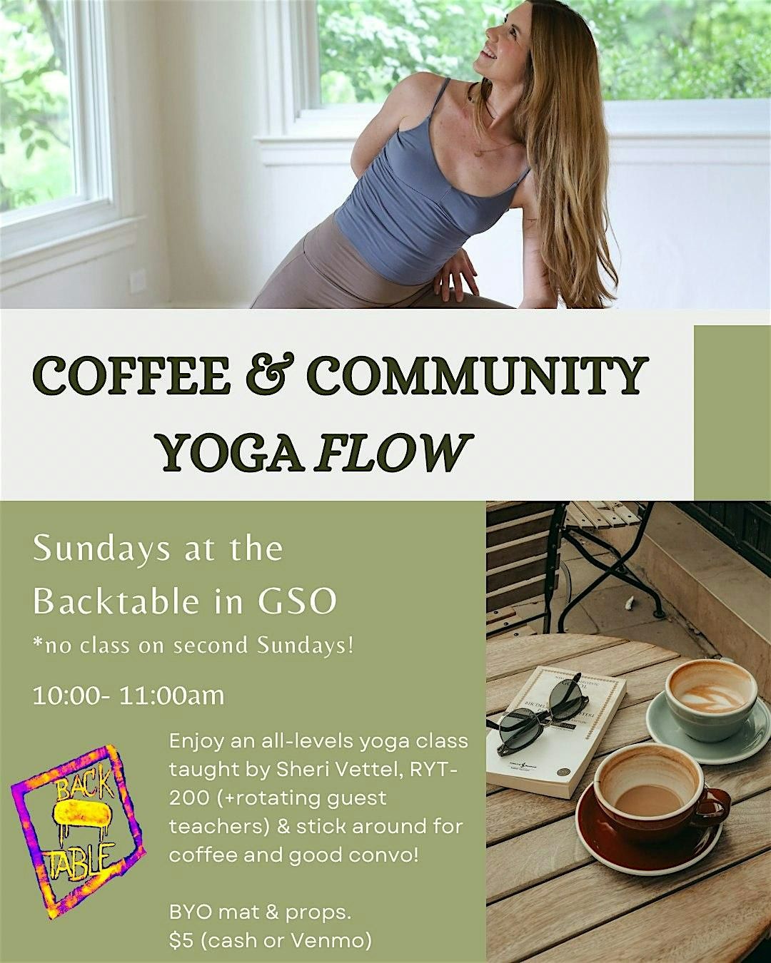 Yoga led by: Sheri Vettel, RYT-200 (@food.and.flow.nutrition.and.yoga) with rotating guest teachers each month!