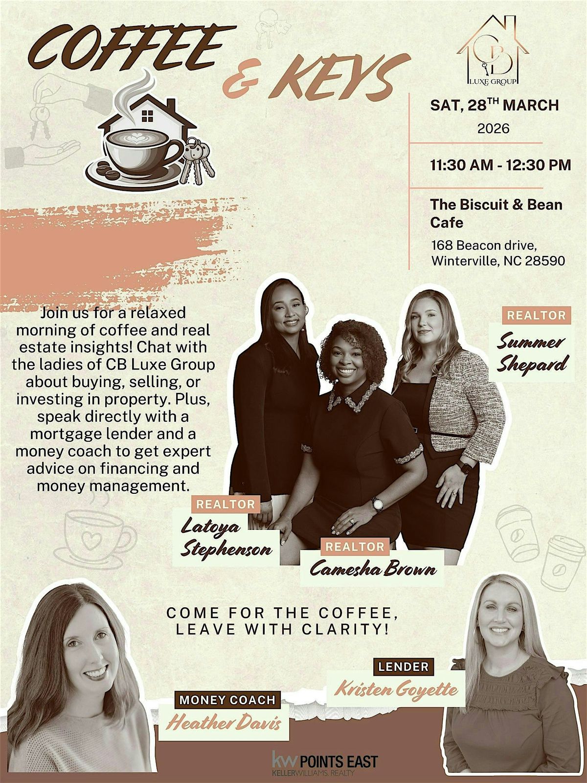 At The Biscuit and Bean Cafe, Saturday, the 28th, from 11:30 AM–12:30 PM Chat with the ladies of CB Luxe Group about buying, selling, or investing in property. Plus, speak directly with a mortgage lender and a money coach to get expert advice on financing and money management.