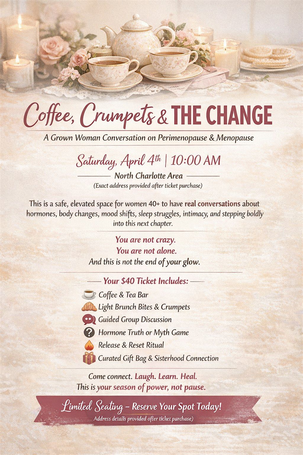 A Grown Woman Conversation on Perimenopause & Menopause📅 Saturday, April 4th⏰ 10:00 AM📍 North Charlotte Area(Exact address provided after ticket purchase)This is a safe, elevated space for women 40+ to have real conversations about hormones, body changes, mood shifts, sleep struggles, intimacy, and stepping boldly into this next chapter.You are not crazy.You are not alone.And this is not the end of your glow.Your $40 Ticket Includes: • Coffee & Tea Bar• Light Brunch Bites & Crumpets• Guided Group Discussion• Interactive Hormone Truth or Myth Activity• Release & Reset Reflection Exercise• Curated Gift Bag• Sisterhood & Safe ConversationCome connect. Laugh. Learn. Heal.This is your season of power, not pause.🎟️ Limited Seating – Reserve Your Spot Today (Address details will be sent after ticket purchase.)