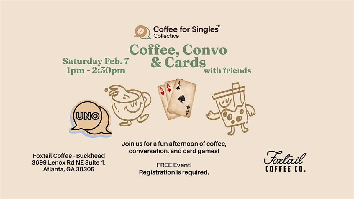 Coffee, Convo, and Cards is a fun afternoon meetup created for single adults who want to get out of the house, make new friends, and enjoy great conversation.
