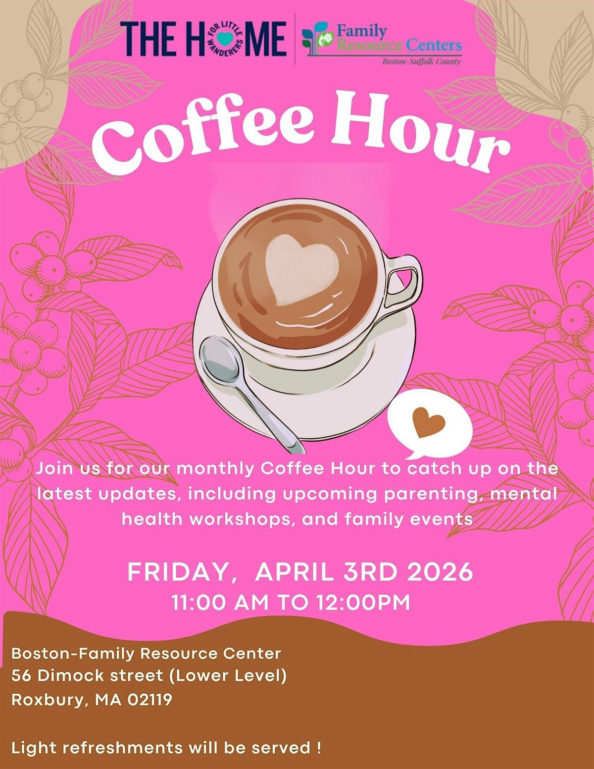 Come hang out with us during Coffee Hour! It's an in-person gathering where you can relax, chat, and sip on your favorite brew. Our staff will share upcoming events and other resources. No pressure, just good vibes and great coffee. See you there!