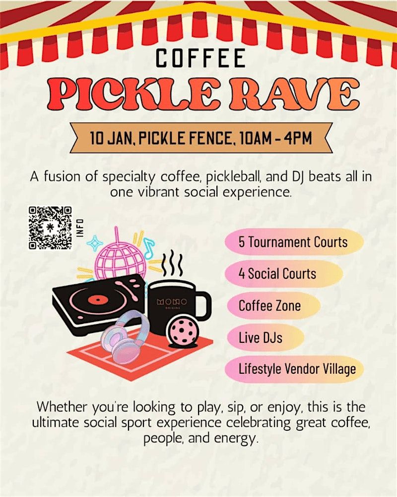 An all-day Coffee Pickle Rave built as a social-first experience, play a few games, grab a coffee, meet new people, dance to the music, and enjoy the community. Whether you’re looking to play, sip, or vibe, this is the ultimate pickleball social celebrating sport, culture, and connection.