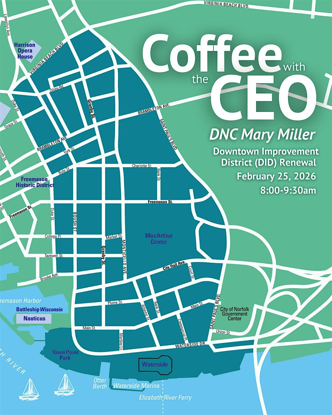 The Downtown Norfolk Council maintains the 50-block Downtown Improvement District (DID) with enhanced services that go above and beyond baseline city services to create a thriving, clean, and safe metropolitan core. The DID was originally established in 1999 and periodically undergoes renewal, including in 2026.