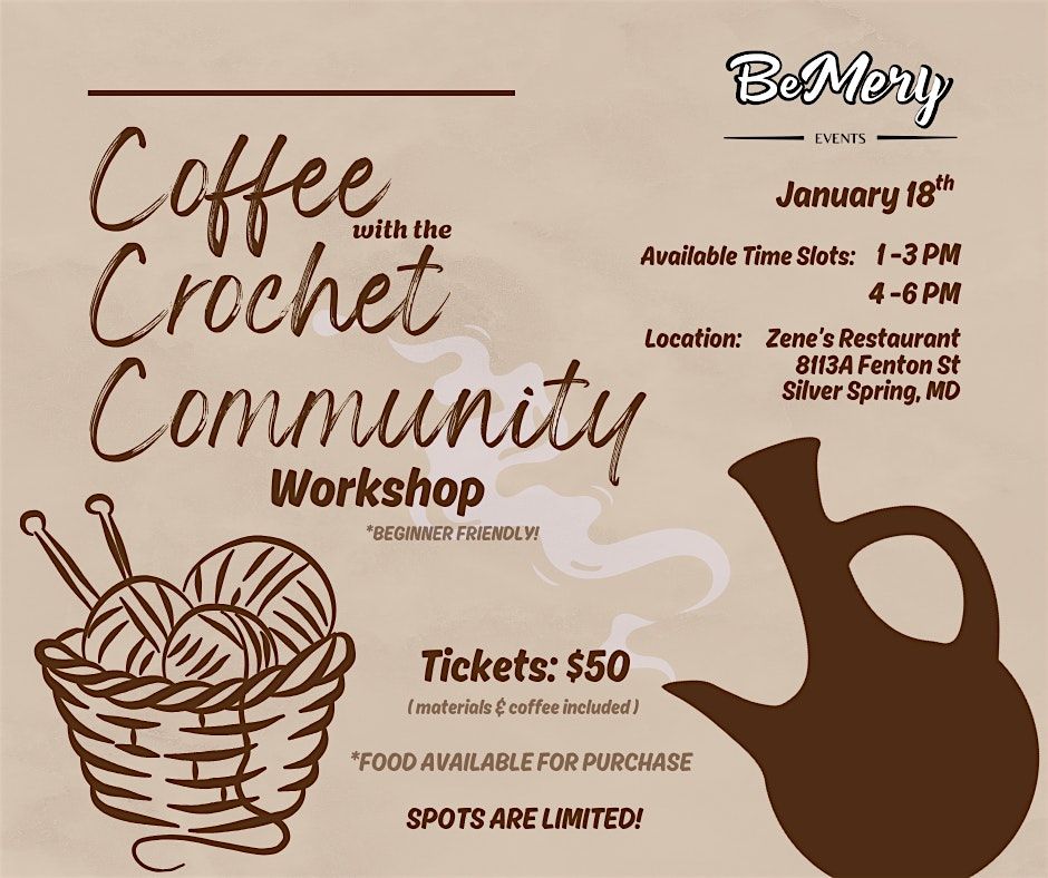 Coffee with the Crochet Community is a cozy, beginner-friendly crochet workshop hosted inside a local Ethiopian restaurant. Zene’s Restaurant: 8113A Fenton St, Silver Spring, MD. Slow down, sip coffee inspired by the buna tradition, and learn the basics of crochet in a relaxed, supportive setting. No experience needed—just bring yourself. All materials and coffee are included. Limited spots available.