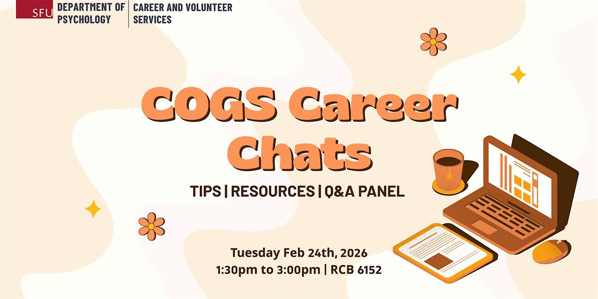 In collaboration with SFU Career and Volunteer Services, the Department of Psychology & Cognitive Science is hosting an in-person event COGS Career Chats to answer your questions about post-graduation options and career pathways! (For example, what can I do with a degree in COGS? What can I do to set myself apart in the job market?)