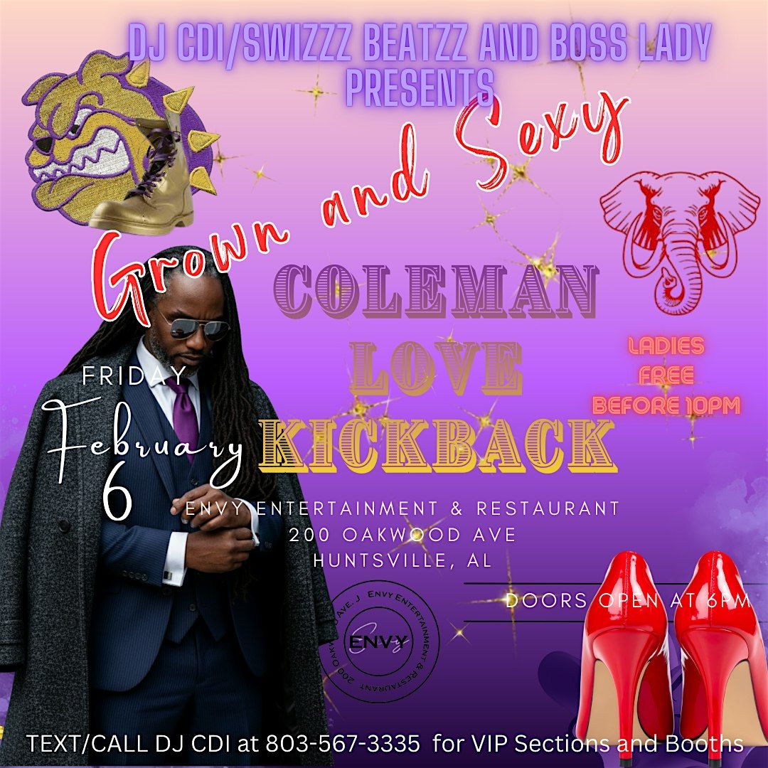 Huntsville Grown and Sexy Crowd, get ready to enjoy the Coleman Love Kickback! This event is about good vibes and great company. Everyone is invited. Bruhz and Sorors welcome! Mix and mingle and kick back and relax. Don’t miss out on the fun — come join us! Contact (803)567-3335 for questions about VIP sections and bottle pricing.