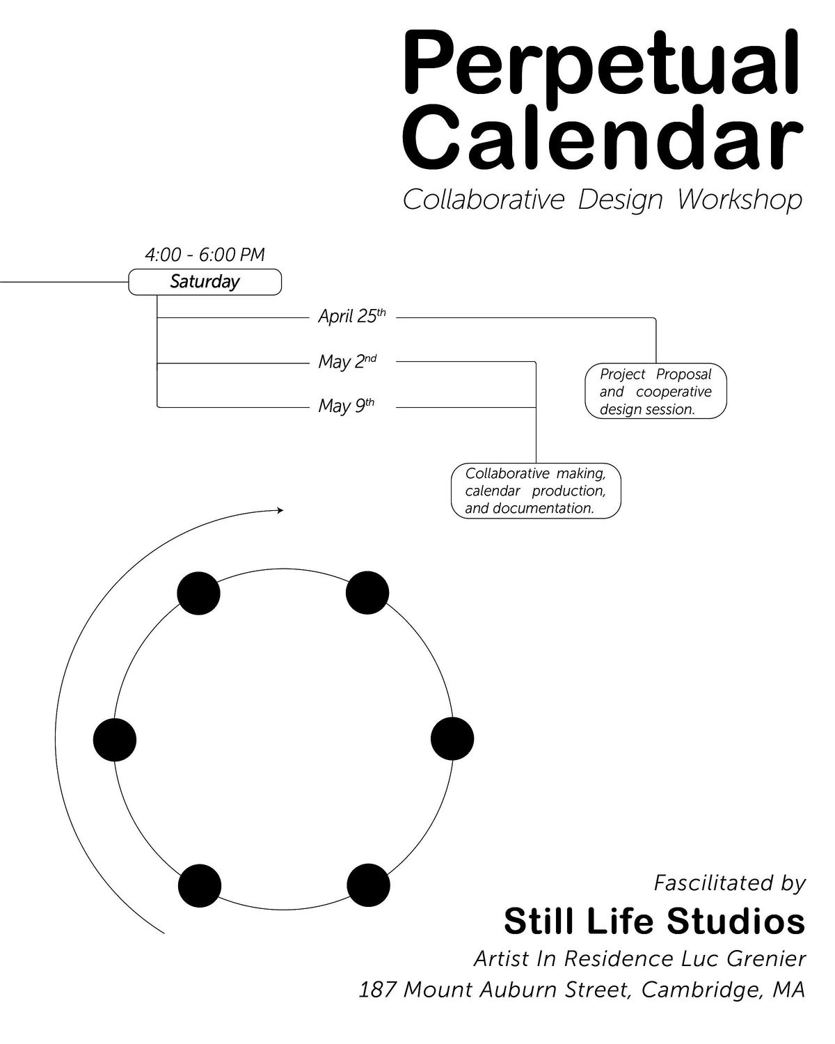 A perpetual calendar is a catalogued delineation of time that doesn’t expire at the end of the Gregorian year. There are fourteen different configurations of the calendar year, and we are producing all fourteen of them in one site-specific installation for the studio space. Artist in Residence, Luc Grenier, is facilitating a collaborative design workshop at Still Life Studios in three weekly sessions where we will be cooperatively exploring how we ritualize and account for the passing of time. Join us for all three, or come whenever you can.