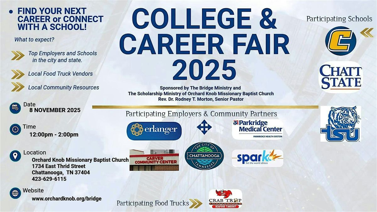 Are you a High School Senior, a Recent Graduate, a College Student looking for work, or an Adult exploring new career paths? Join us for our College and Career Fair. Sponsored by The Bridge Ministry and The Scholarship Ministry here at Orchard Knob Missionary Baptist Church. This is a one stop event, designed to inspire and equip you for the next step in your journey. Featuring Top Employers and Schools in the City and State. We will also have The Crab Trap Food Truck onsite! Come to network, speak to recruiters, and don't forget to bring your resumes! You don't want to miss this event! For more information visit our website at orchardknob.org/bridge.