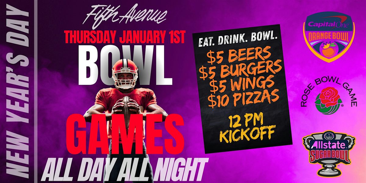 Kick off the New Year with all THREE College Football Bowl Games! 12pm Doors. Food & Drink Specials! Orange Bowl, Rose Bowl, Sugar BowlAbout this Event