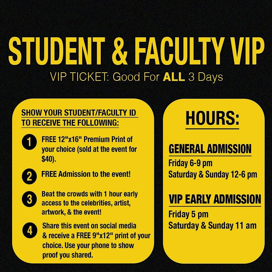 - Beat the crowds by getting 1 hour early admission before the doors open to the general public - giving you access to the celebrities, artist, artwork & the event itself (good for all 3 days).