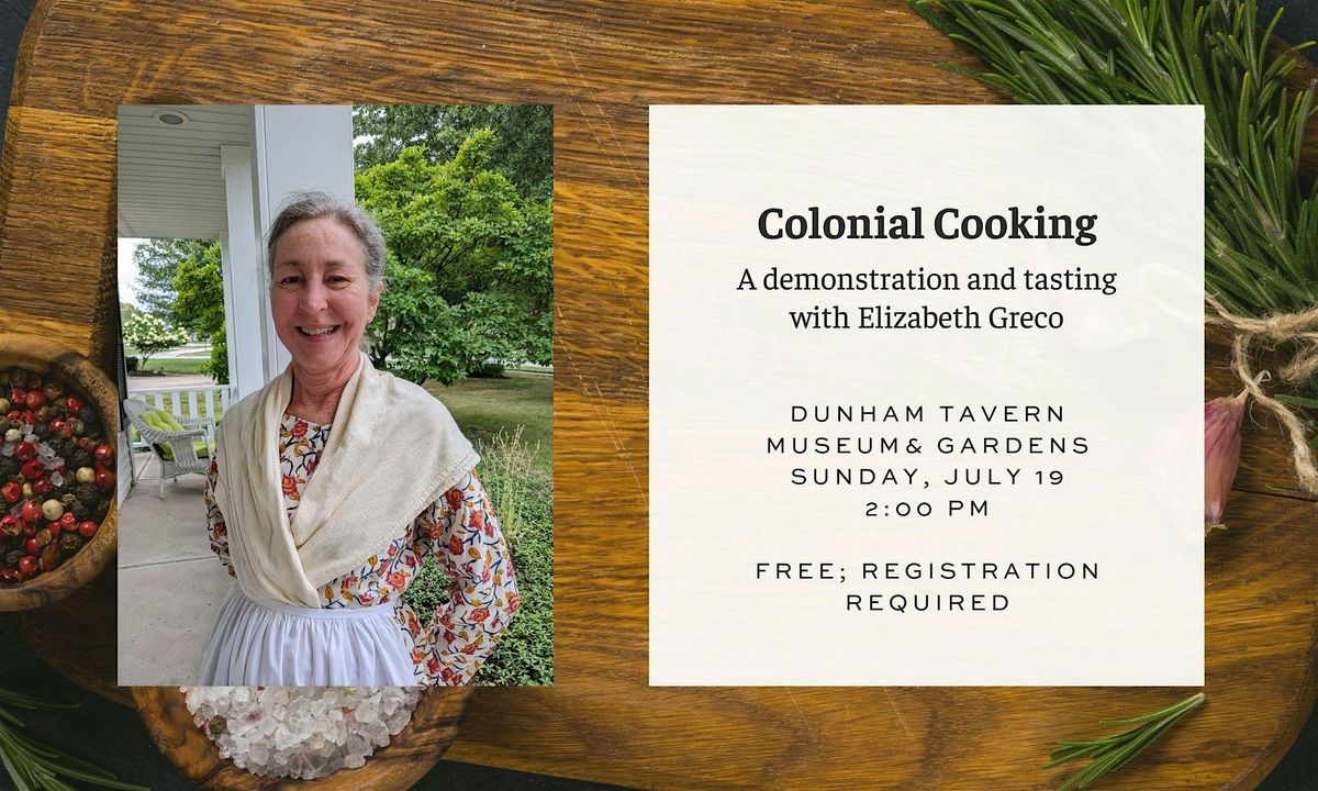 Enjoy a taste of the past as you learn about how people cooked and what they ate. Teacher and historic foodways enthusiast Elizabeth Greco will prepare some early American recipes and discuss some of the major changes in cooking and baking of the time period. Attendees will get to sample the items made. Outdoors, weather permitting.