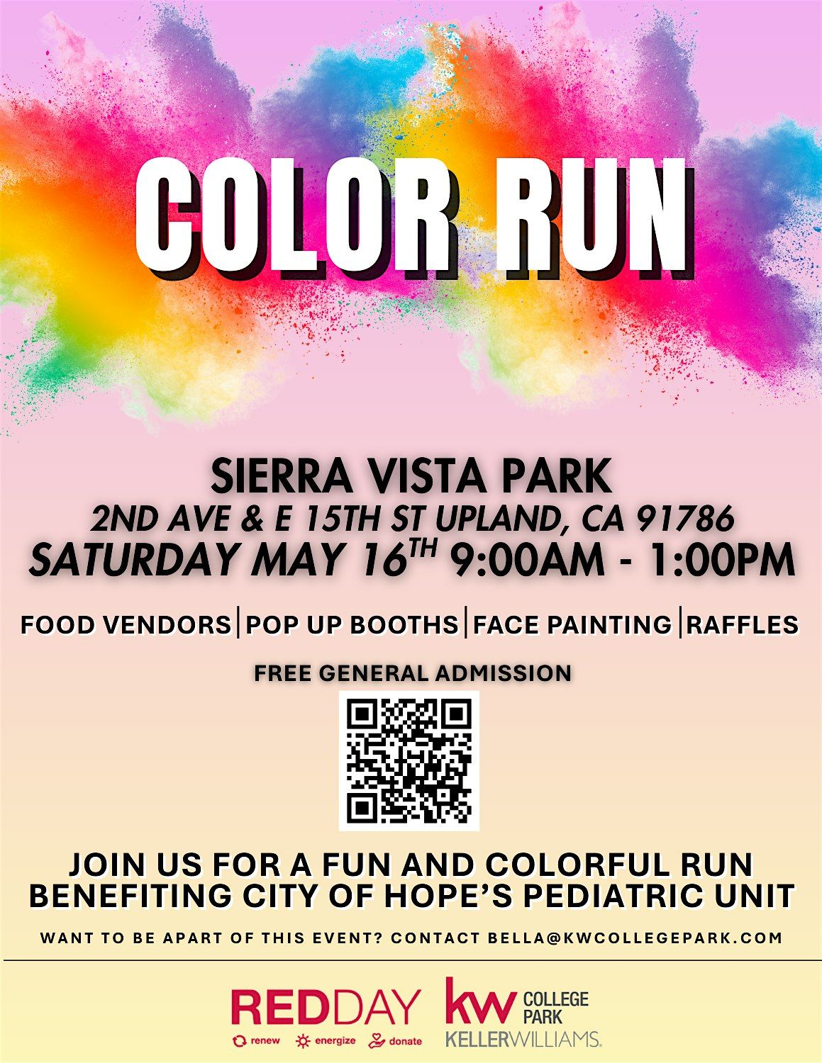 Join us for a fun, family-friendly Color Run at Sierra Vista Park in Upland! Enjoy a vibrant morning filled with movement, music, food vendors, pop-up booths, face painting, raffles, and community spirit.