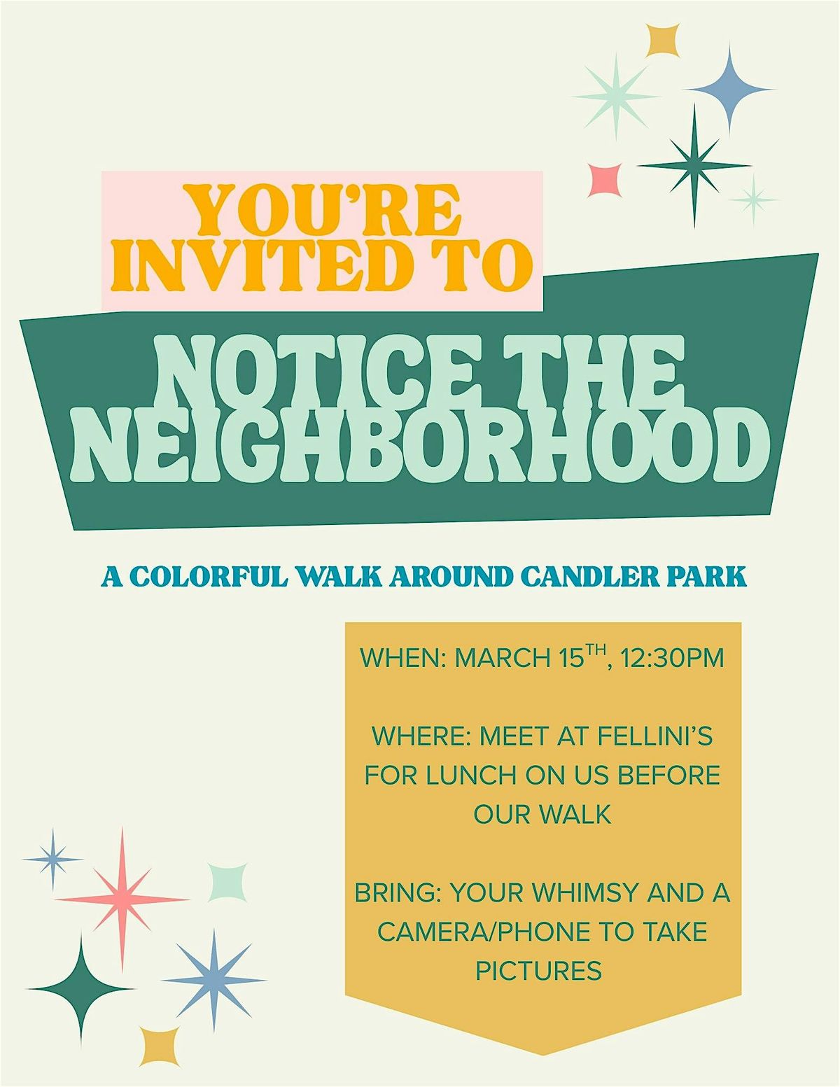 Welcome to the Color Walk and Lunch event! Join us at Fellini's Pizza on March 15, 2026 at 12:30 PM for a fun-filled day. Get ready to stroll through the neighborhood, enjoy vibrant colors, and indulge in delicious pizza!