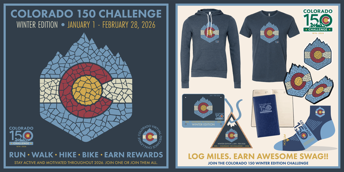 - Upgrade (optional): If you like, add on the Winter Edition unisex t-shirt or unisex hoodie, OR upgrade to VIP GOLD to receive all of the Winter Edition swag items + more! Also check out our 2026 Colorado 150 Challenge Season Pass!