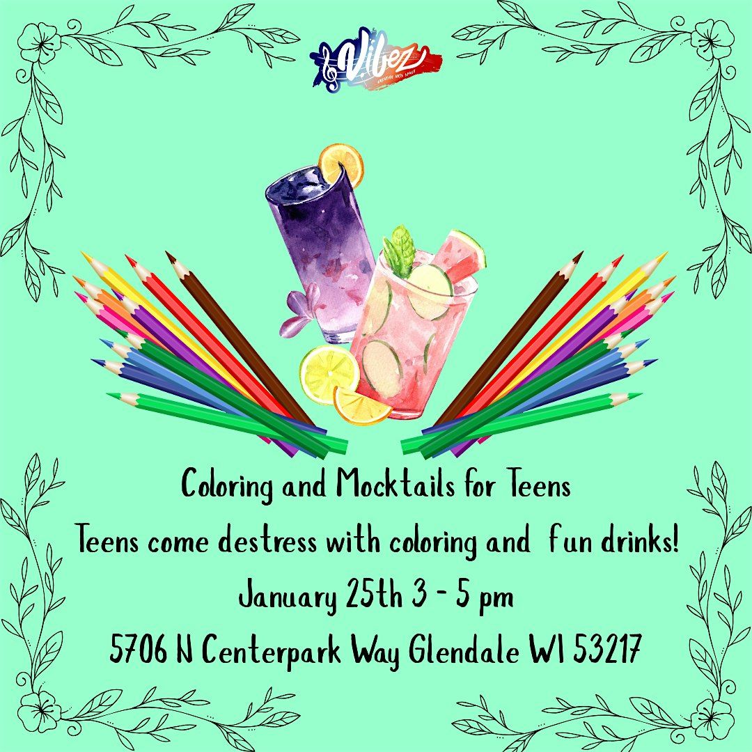 Teen Coloring & Mocktails! Ages 13-18. Jan 25th, 3-5pm. Relax, color, sip delicious drinks & vibe. All supplies included!About this Event