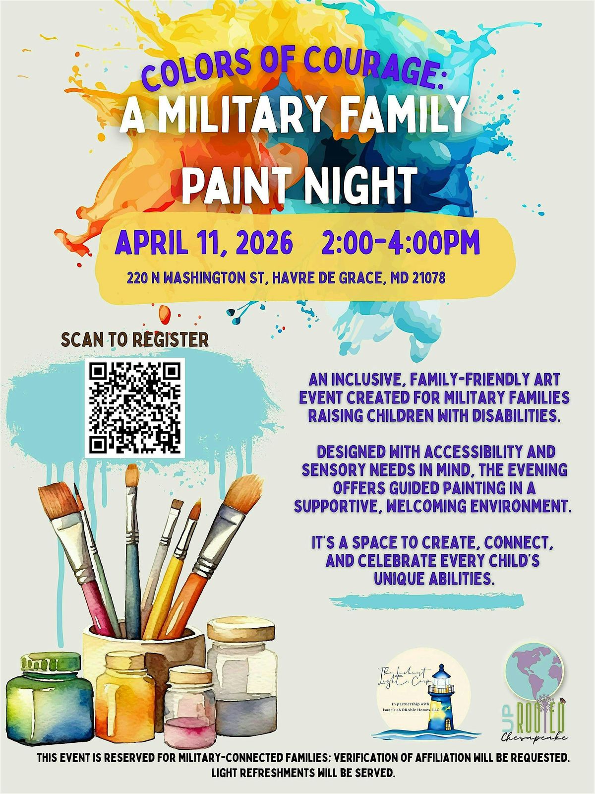 Families can be active or retired military. They must provide proof of military affiliation. Max. of 20 participants. Designed with accessibility and sensory needs in mind, the evening offers guided painting in a supportive, welcoming environment.It’s a space to create, connect, and celebrate every child’s unique abilities. Light refreshments will be served. This event is a collaboration between UProoted Chesapeake, Inc, and the Luckiest Light. Please register using this link https://forms.gle/5LD7z2w1sJ7PACkk6