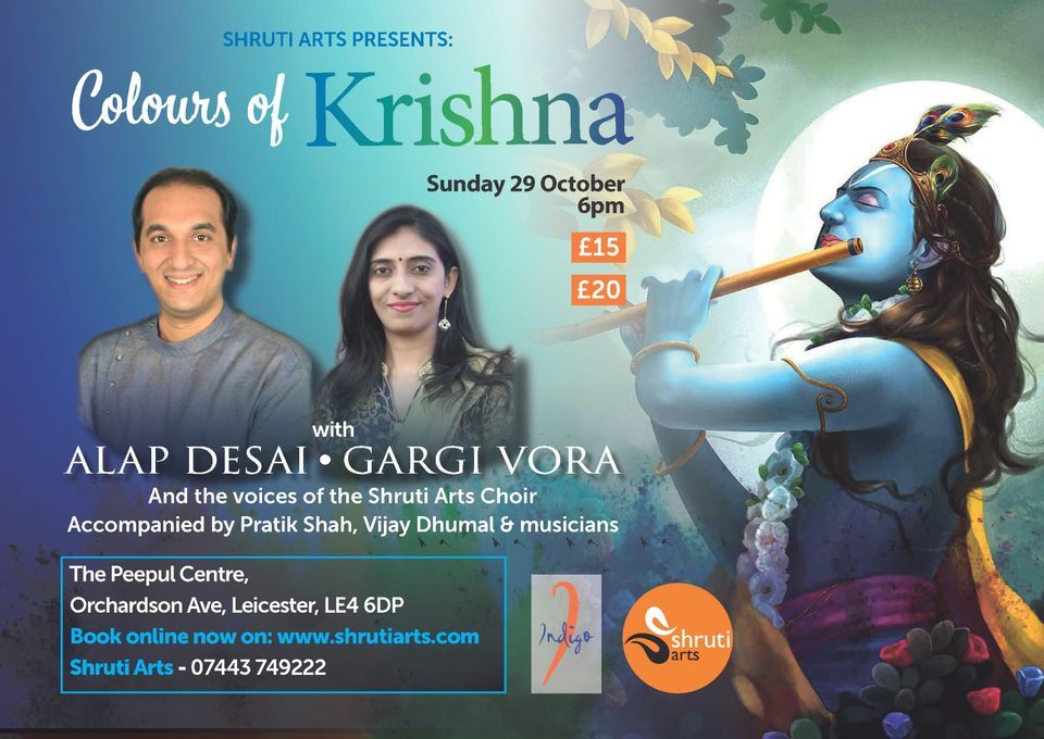 Join us as we celebrate 40 years of Shruti Arts!A unique opportunity to enjoy geet and bhajans celebrating Lord Krishna with renowned singers Alap Desai and Gargi Vora from Mumbai. They will be joined by Shruti Arts workshop participants from across the UK in a unique community and artist collaboration. A concert not to be missed!