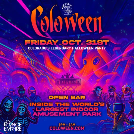 18th Annual Coloween 2025: Haunted Fun House at Bounce Empire Colorado's #1 Adult Halloween Party This year, Coloween is reimagined inside Bounce Empire , the world’s largest indoor inflatable park , transformed into an exclusive, adults-only Halloween playground. And here’s the kicker: every ticket includes an all-inclusive open bar. Unlimited premium cocktails, wine, and beer all night long. No drink lines. No tabs. No worries. Coloween 2025 Re-imagined: VIP open bar, DJs & Denver’s top costume contest inside the world’s largest inflatable park. All-Inclusive Open Bar – Sip unlimited cocktails, champagne, wine & beer all night. Bounce Empire Takeover – 50,000 sq. ft. of neon-lit inflatables, slides, lounges & immersive attractions. 360° Hydraulic DJ Stage – Surrounded by Funktion-One sound & a 64-foot translucent LED screen. World-Class DJs & Performers – Dance to EDM, house, and remixes while aerialists & costumed performers electrify the night. Denver’s Top Halloween Costume Contest – This year’s twist: a haunted Fun House obstacle course. Prizes for style, creativity & performance. Exclusivity Redefined – Only 500 tickets for a true VIP experience. No overcrowding. No chaos. The Experience Sipping craft cocktails under a massive LED wall, surrounded by friends in incredible costumes, while the DJ drops an anthem and a fire breather passes by. Then, you sprint down a 30-foot slide, bounce through a haunted fun house, and head back to the dance floor to lose yourself in Funktion-One-level sound. That’s Coloween: equal parts nightclub, festival, and playground — all wrapped into one unforgettable Halloween night at Bounce Empire. Details 📍 Bounce Empire – Lafayette, CO (20 min west of Denver) 📅 Friday, October 31st, 2025 🕘 9:00 PM – 3:00 AM 🎟 Tickets include drinks + access to all attractions