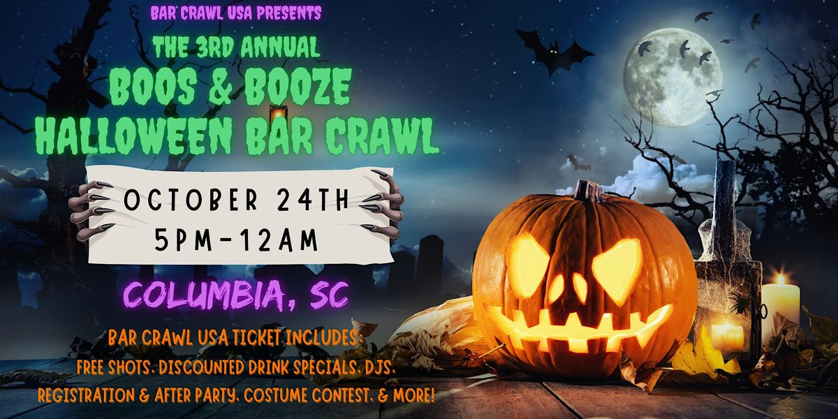 Columbia, get ready for a frightfully fun night! The Boos & Booze Halloween Bar Crawl is back โ grab your costume, your crew, and your thirst for boos and booze! Enjoy haunted drink specials, spooky DJs, costume contests, giveaways, and more as you crawl through Columbia's best bars in The Vista.