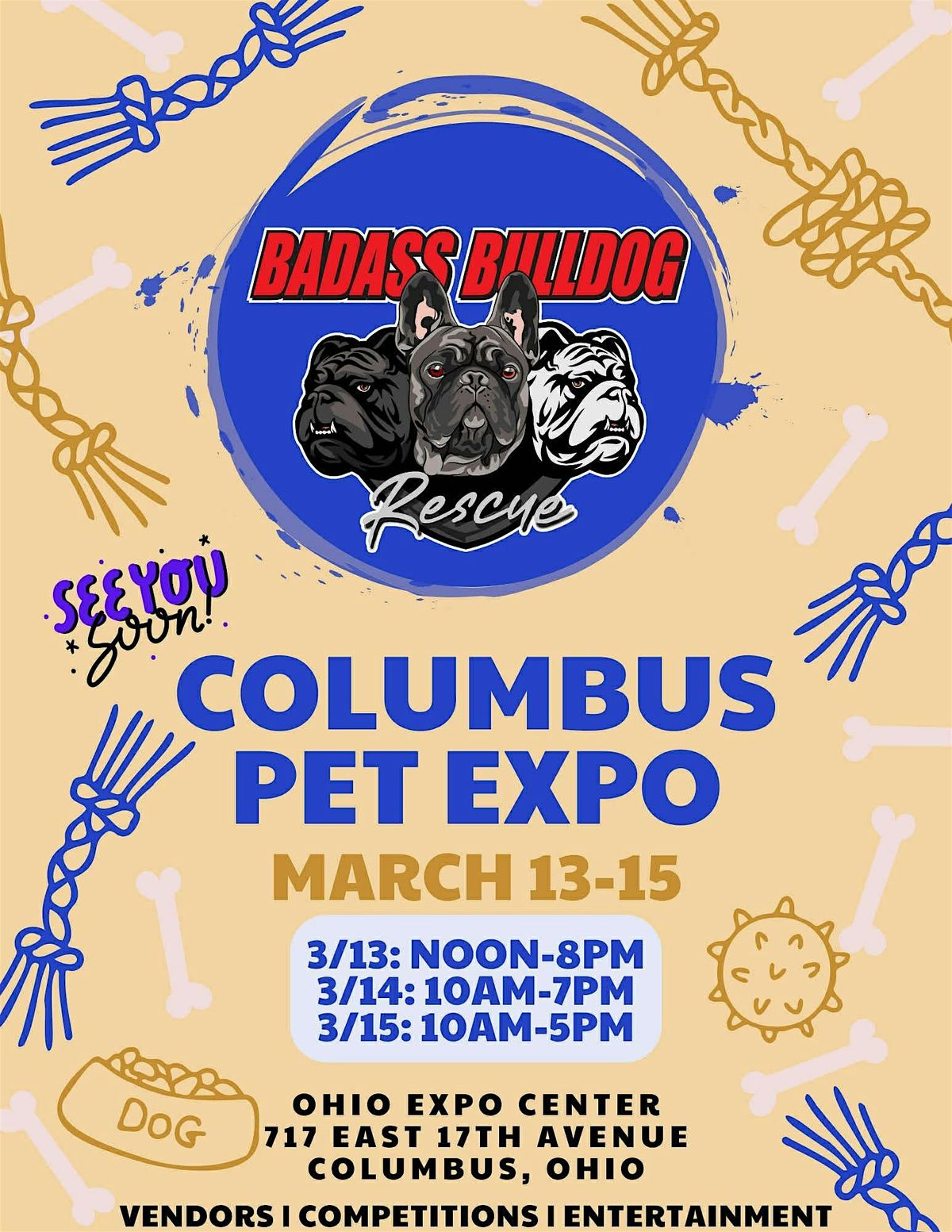 Badass Bulldog Rescue will be set up at Columbus Pet Expo from noon to 8pm on March 13th, 10am to 7pm on March 14th, and 10am to 5pm on March 15th!