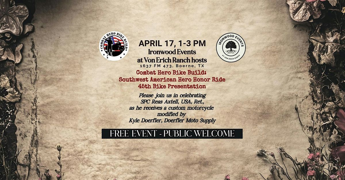 Join CHBB at Ironwood Events at Von Erich Ranch, 1637 FM 473, Boerne, TX, on April 17 , 2026, from 1-3 PM (local) as we celebrate SPC REAS AXTELL, USA, RET., receiving his custom motorcycle modified by Kyle Doerfler, Doerfler Moto Supply.