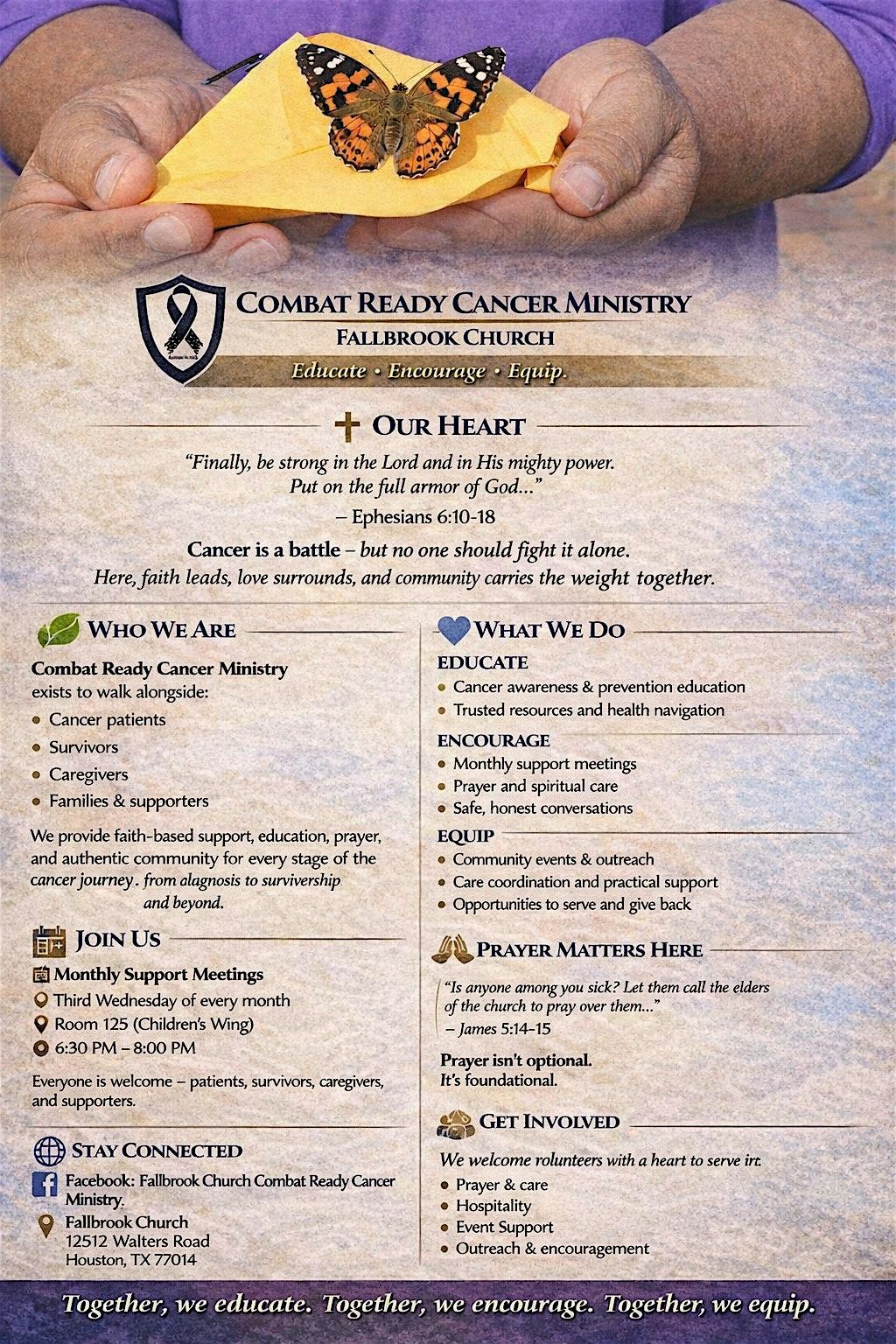 WHO WE ARE Combat Ready Cancer Ministry exists to walk alongside: • Cancer patients • Survivors • Caregivers • Families & supporters We provide faith-centered support, education, prayer, and authentic community for every stage of the cancer journey — from diagnosis to survivorship and beyond.