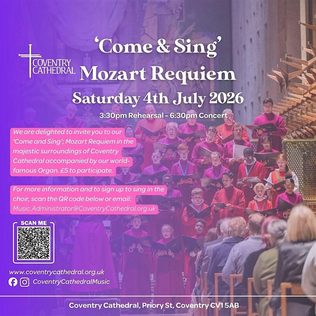 In what is the first for many years at Coventry Cathedral, the Music Department are delighted to invite you, your choir or other singing friends to our first large scale ‘Come and Sing’; Mozart Requiem, on Saturday 4th July 2026. In the majestic surroundings of Coventry Cathedral accompanied by our world-famous Harrison and Harrison Organ, this promises to be a spectacular Come & Sing Event for all involved!