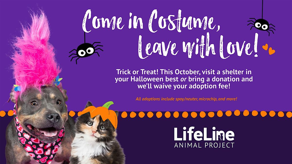 TRICK OR TREAT THIS OCTOBER! All spooky season long, if you visit a LifeLine shelter in costume OR bring a donation with you, we will WAIVE your adoption fee!