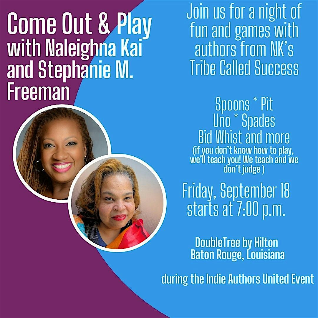Authors Naleighna Kai and Stephanie M. Freeman invite you to come play with us at the DoubleTree by Hilton Baton Rouge on Friday, September 18 at 7:00 p.m. EST. This is all about fun and getting to know us. General admission is free, but VIP coes with extra perks-- gift bags sponsored by Cavalcade of Authors or Book Lovers Con.