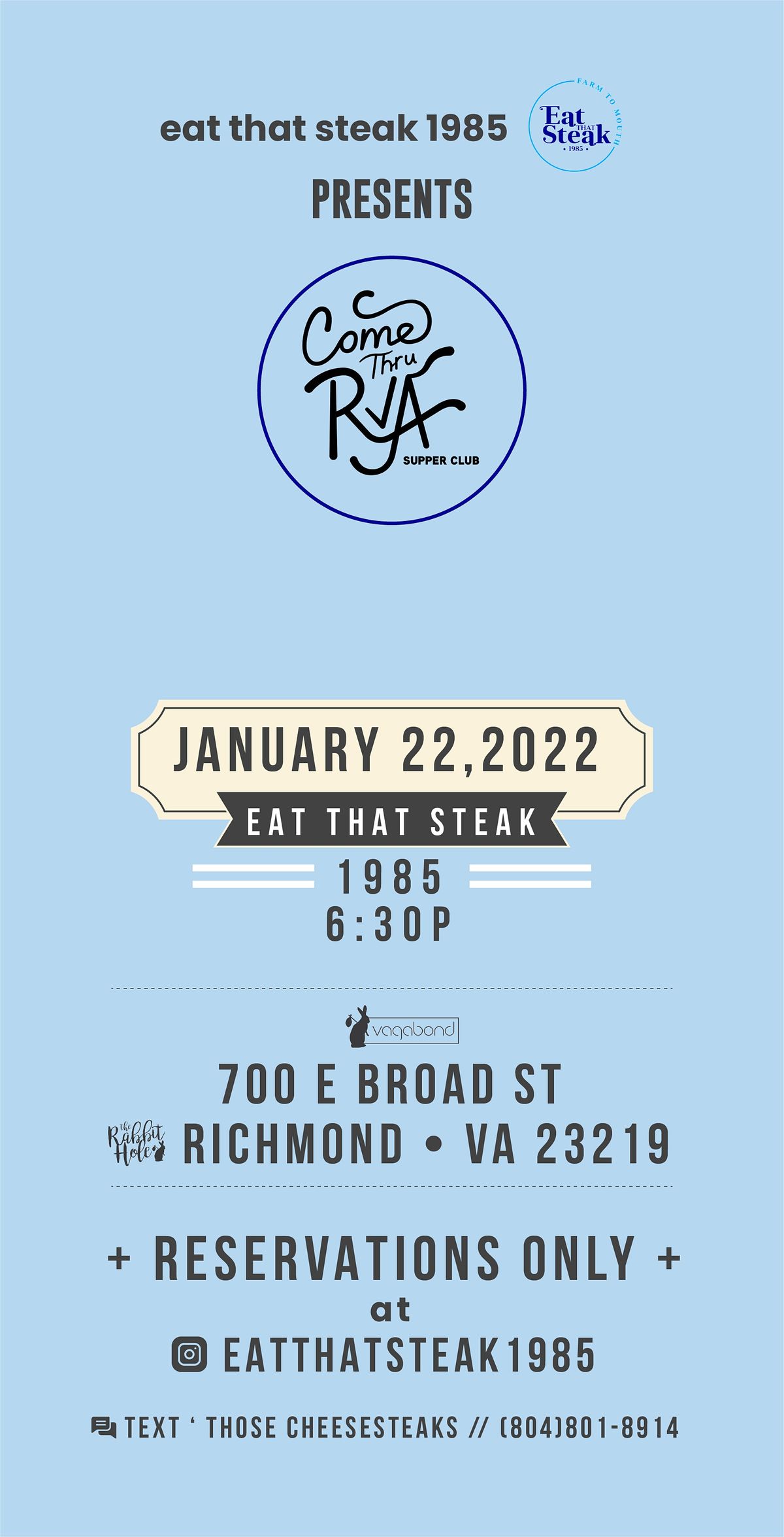 Come Thru RVA supper club is a monthly event that serves cheesesteaks from Eat that Steak 1985 along with showcasing music,art and more.About this Event
