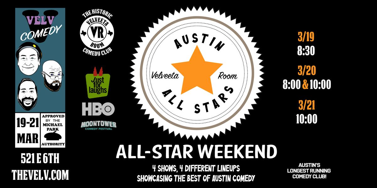 The Austin comedy scene is booming - and The Velv has been at its center for over 38 years. We're celebrating All-Star Weekend with the best this town has to offer, featuring comics from SXSW, Moontower Comedy Festival, and more! We've got 4 shows with 4 different lineups - all hits, no skips! If you've wanted to check out the Austin scene, you can't go wrong with any of these shows!