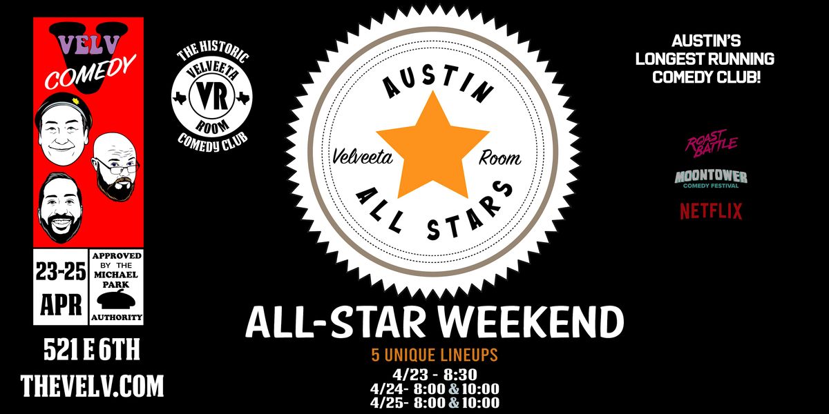 The Austin comedy scene is booming - and The Velv has been at its center for over 38 years. We're celebrating All-Star Weekend with the best this town has to offer, featuring comics from SXSW, Moontower Comedy Festival, and more! We've got 5 shows with 5 different lineups - all hits, no skips! If you've wanted to check out the Austin scene, you can't go wrong with any of these shows!