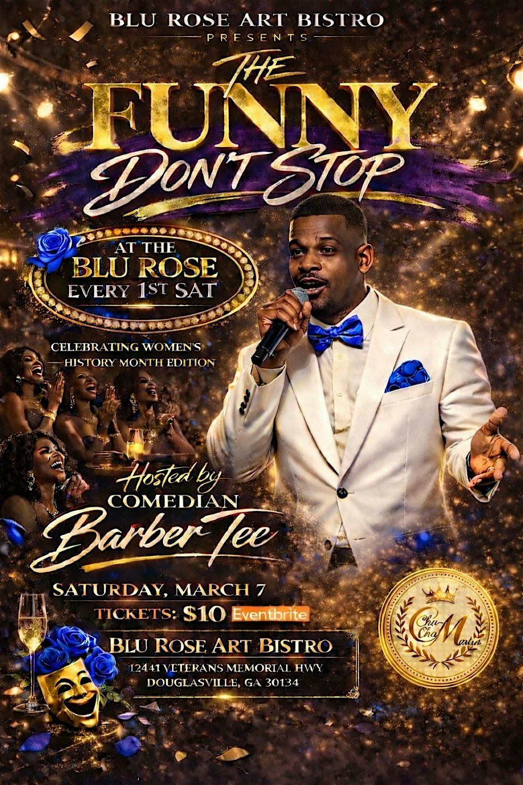 Come laugh your heart out with us every first Saturday at the cozy Blu Rose! It's a super chill, in-person night packed with awesome laughs, good vibes, and great company. Whether you're looking to hang out with friends or just need a mid-month pick-me-up, this is the place to be. Don't miss out on the fun – grab your spot and get ready for some seriously funny moments!
