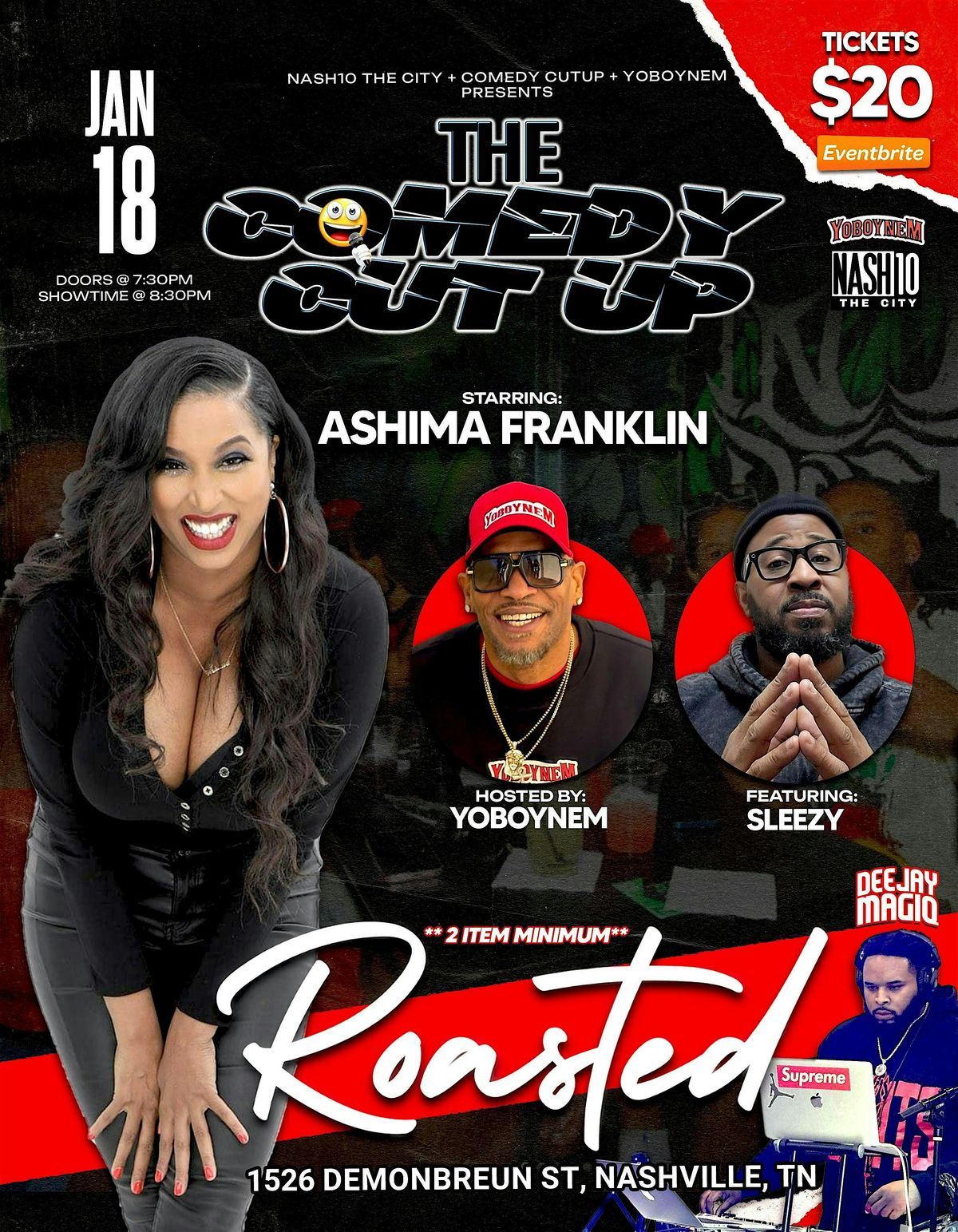 Get ready for an evening full of laughs! Join us in person for Comedy CUTUP, where the hilarious Ashima Franklin takes the stage to deliver sharp wit and unforgettable jokes, featuring Deric "SLEEZY" Evans, hosted by YOBOYNEM. It's the perfect chance to catch some genuine humor, meet new people, and enjoy a night out at Roasted on historic Music Row. Don't miss this fun-filled event that's sure to keep you cracking up!