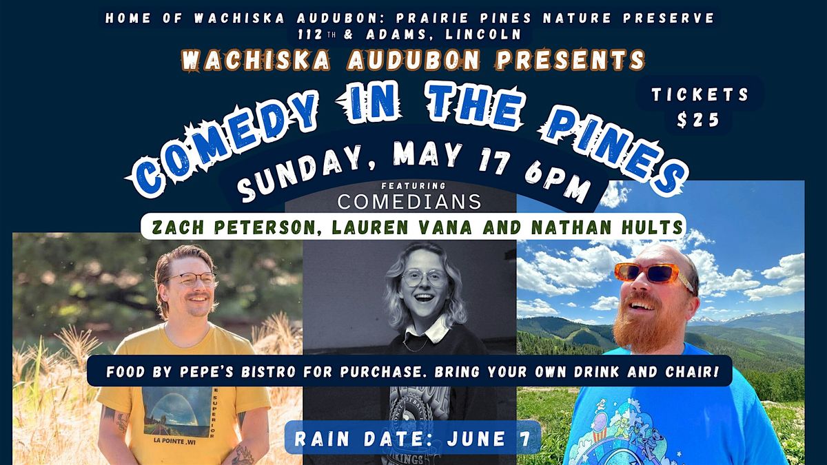 **About COMEDY IN THE PINES: Get ready for a night of laughs under the stars at Wachiska Audubon's property, Prairie Pines Nature Preserve! All proceeds go to the performers and Wachiska Audubon.