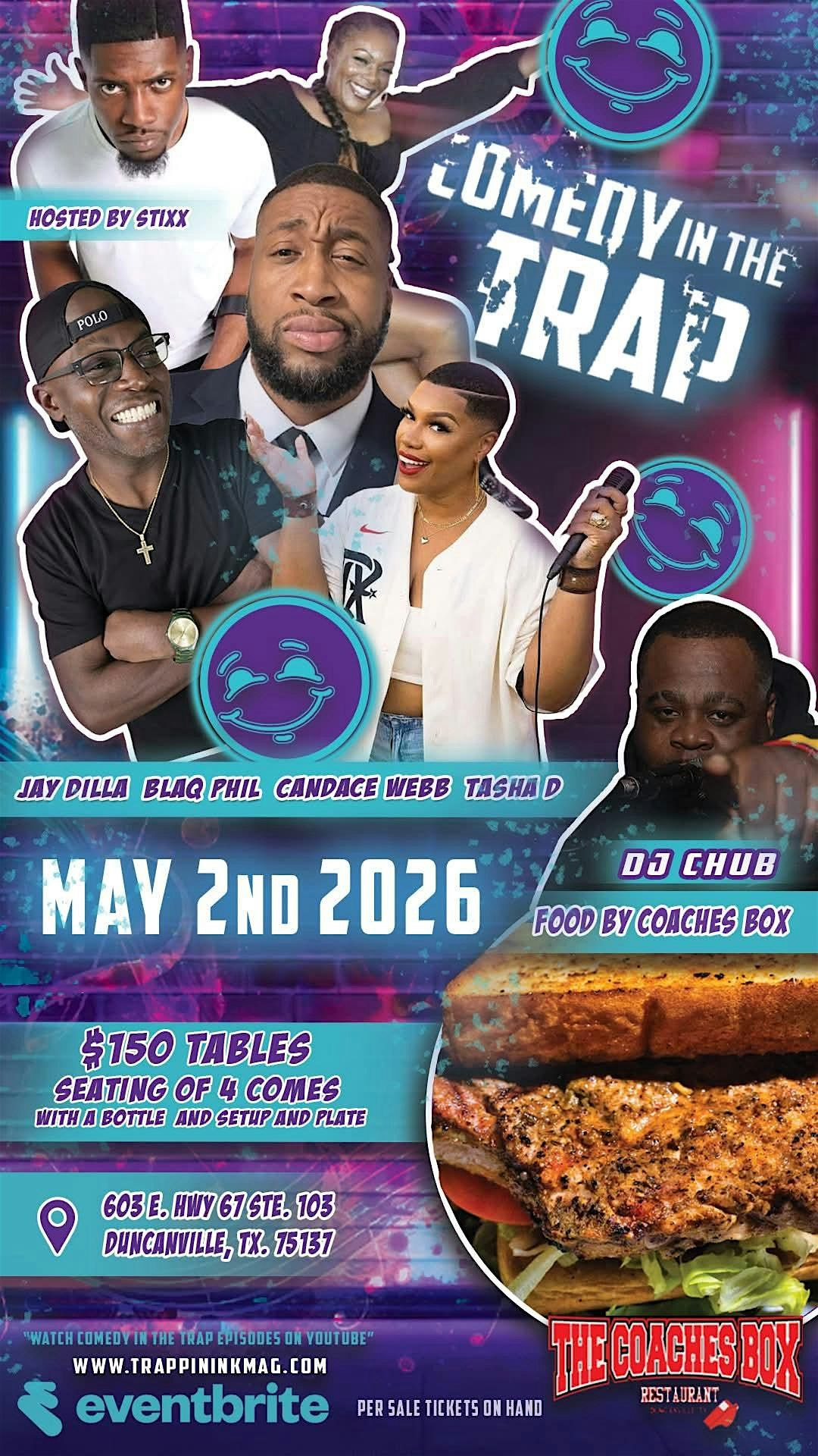 Comedy in the Trap May 2! Featuring Jay Dilla, Blaq Phil, Candace Webb & Tasha D, hosted by Stixx. Good vibes, big laughs, don’t miss it!