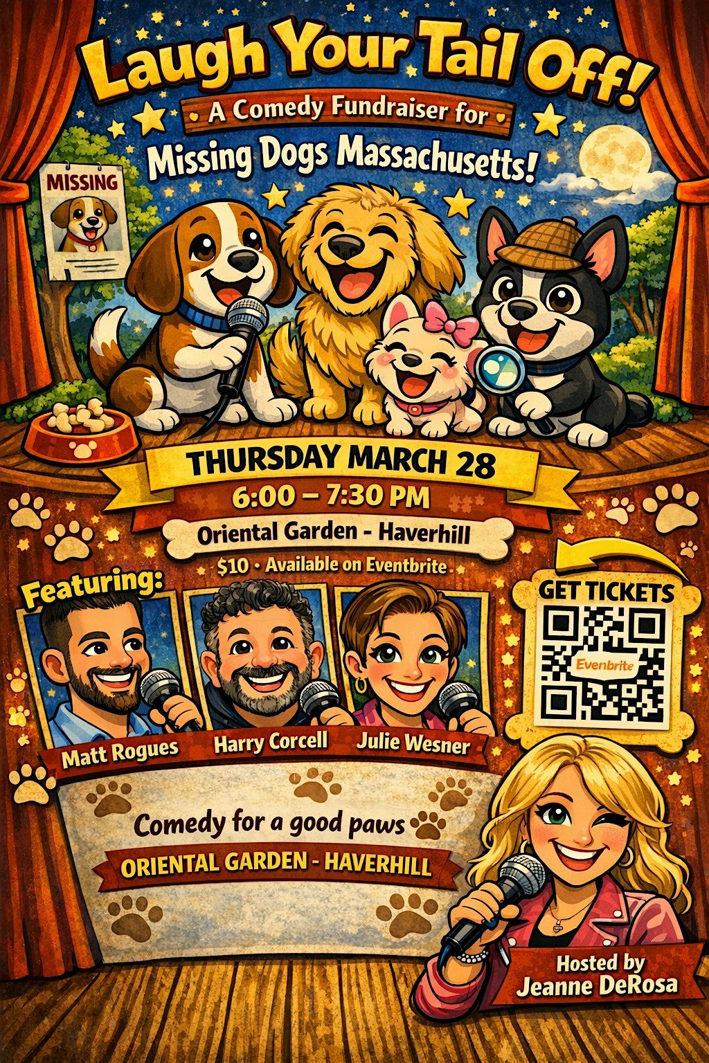 Comedy for a great cause featuring Harry Corcell, Matt Rogues, Julie Wesner, and Jeanne DeRosa With special guests. All proceeds will go to the Missing Dogs of Massachusetts.