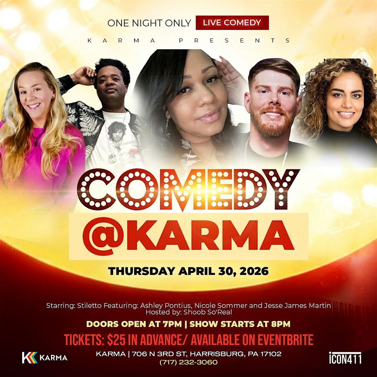 Get ready for an unforgettable night of laughter as Karma transforms into Harrisburg’s premier comedy club for one night only! On Thursday, April 30, we’re bringing together a powerhouse lineup of comedic talent that you won't want to miss.