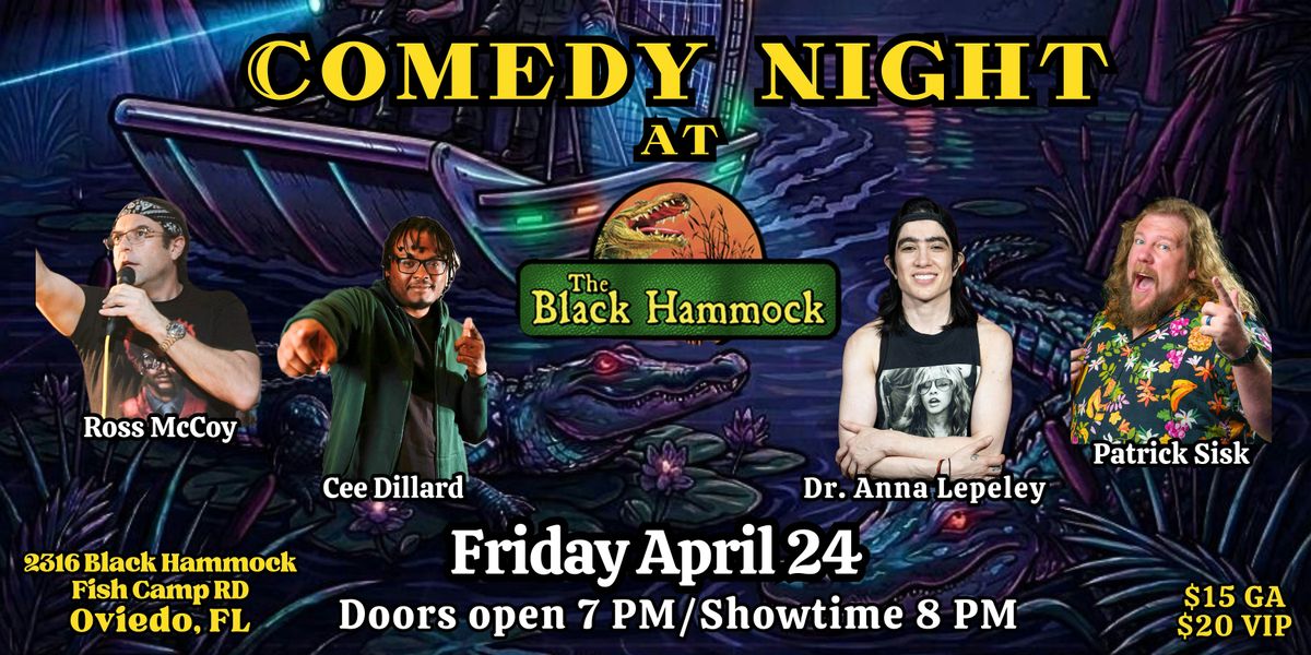 Friday April 24, comedy returns to the Black Hammock Restaurant in Oviedo, FL starring nationally touring comedians: Ross McCoy, Cee Dillard, Dr. Anna Lepeley, and Patrick Sisk.