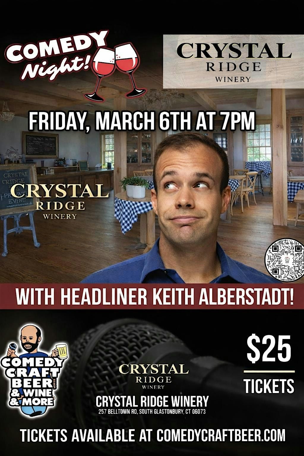 Get ready to laugh your socks off at the Comedy Night happening right at Crystal Ridge Winery! Enjoy a fun-filled evening in person with great vibes, fantastic wine, and hilarious comedians who'll keep the laughs coming all night long. Bring your friends, sip on some amazing local wine, and experience a night of pure entertainment in a cozy, welcoming setting. Don’t miss out on the fun!