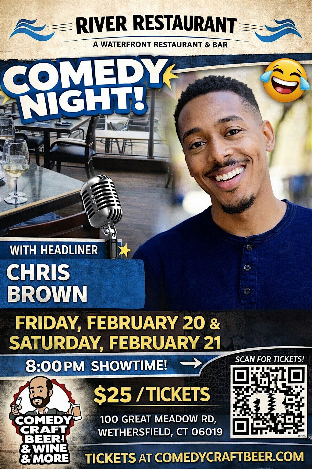 Get ready for a night full of laughs at Comedy Night at River! Join us in person for some hilarious stand-up, great vibes, and good company by the river. Whether you're coming with friends or flying solo, it's the perfect way to unwind and enjoy some top-notch comedy. Don’t miss out on the fun — bring your best laugh and let’s make it a night to remember!