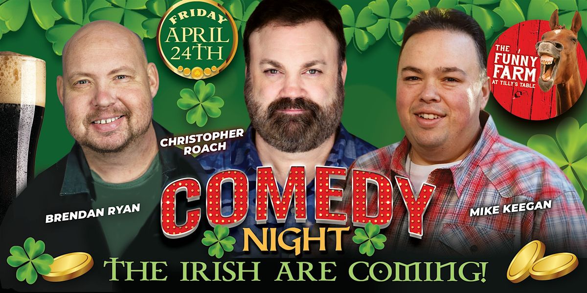 🍀 The Irish are Coming to The Funny Farm at Tilly’s Table on Friday, April 24th, for an evening that starts with a generous all-you-can-eat buffet and ends with nonstop laughs from Christopher Roach, Mike Keegan, and Brendan Ryan. 🍀