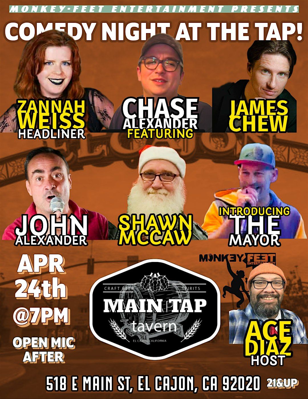 Your host Adrían A. Díaz aka Ace Diaz returns to El Cajon where it all started with comedy! Owner/DJ/Host of monkey-FEET Entertainment has been in the funny business since the pandemic.