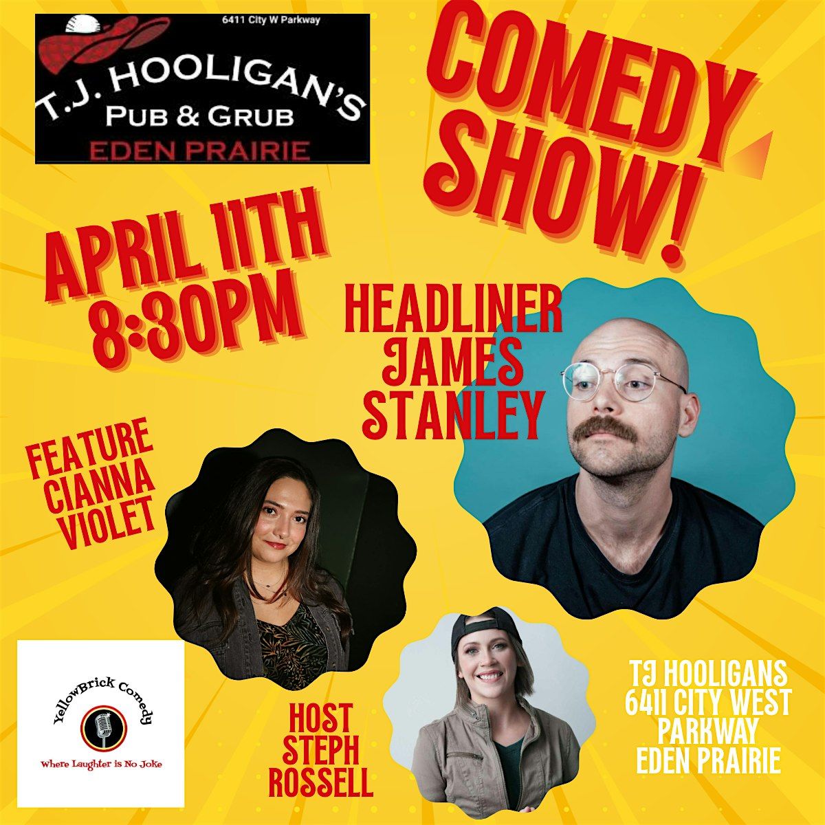 Get ready for a night of top-tier stand-up comedy as Yellow Brick Comedy and TJ Hooligans bring one of the Twin Cities’ best to the stage. Headlining the evening is James Stanley!