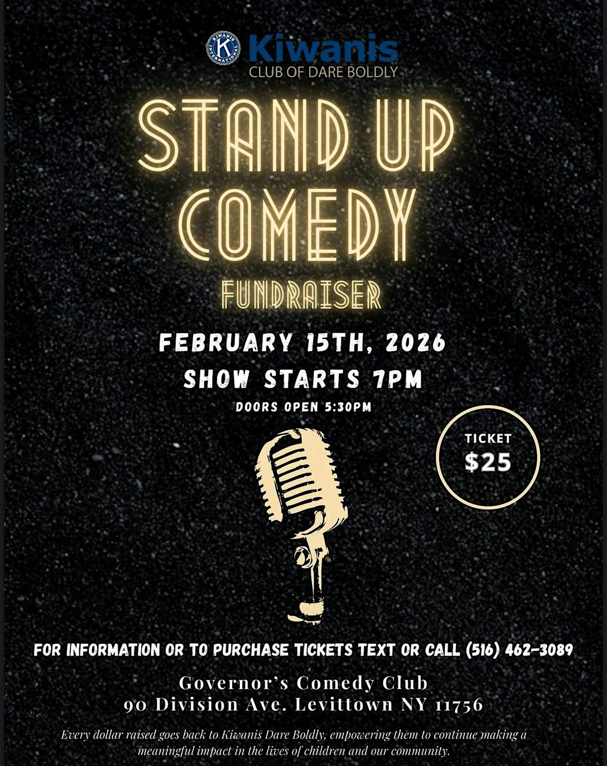 Join us in person for the Kiwanis Dare Boldly Fundraiser — an evening filled with laughs, good vibes, and great company. It's a perfect chance to unwind, support a fantastic cause, and enjoy some top-notch comedy. Don't miss out on the fun and the chance to make a difference!