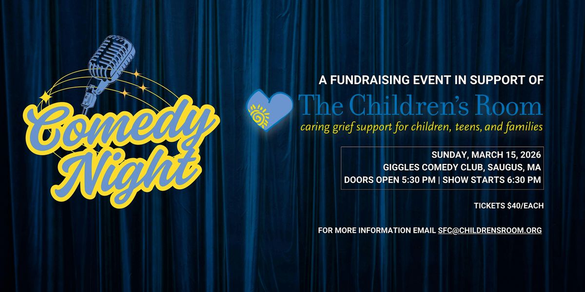 Every laugh fuels our mission. All proceeds benefit The Children’s Room, a nonprofit based in Arlington, MA, providing free grief support to children, teens, families, schools, and community organizations. Your support helps ensure that no child or family has to grieve in isolation.