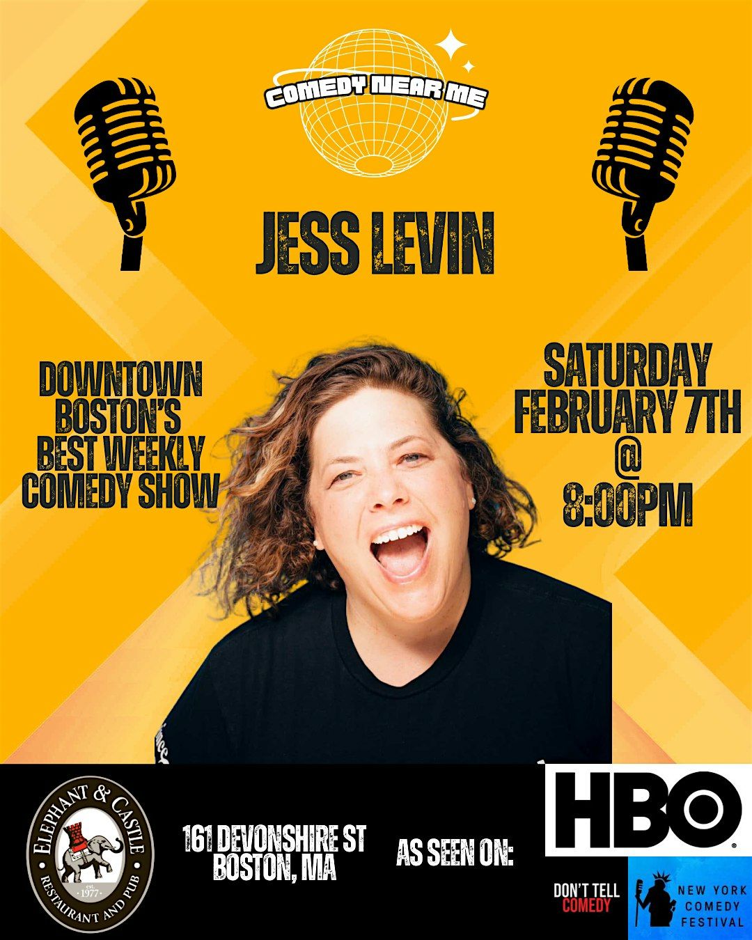 Looking for the Best Comedy Show in Downtown Boston? Catch weekly stand-up comedy at Elephant & Castle, featuring Jess Levin—seen on HBO, Don't Tell Comedy, and New York Comedy Festival. A must-see night at one of the best comedy clubs in Boston with top national talent, great food, and big laughs.