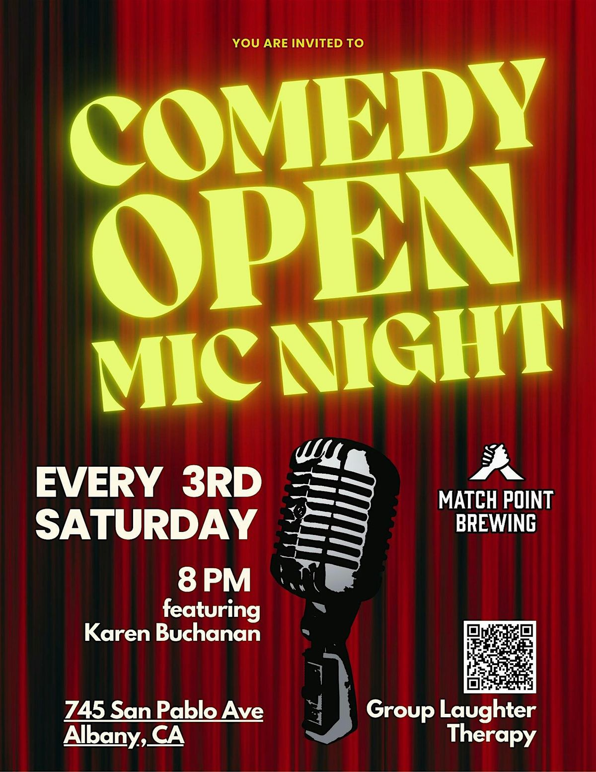 Welcome to Comedy Open Mic Night at Match Point Brewing! Get ready for a night filled with laughter, good vibes, and hilarious comedians taking the stage. Whether you're a seasoned performer or just looking for a fun night out, this event is perfect for anyone who enjoys a good laugh. Grab a drink, sit back, and enjoy the show! Don't miss out on this opportunity to support local talent and have a great time. See you there!