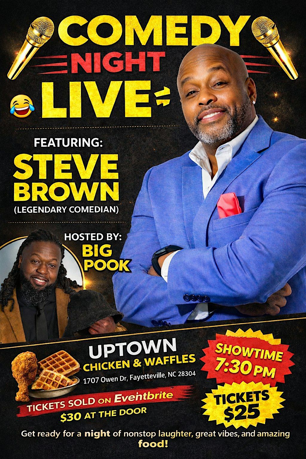Get ready for a night of nonstop laughter at Comedy Night Live featuring legendary comedian Steve Brown, hosted by the hilarious Big Pook.
